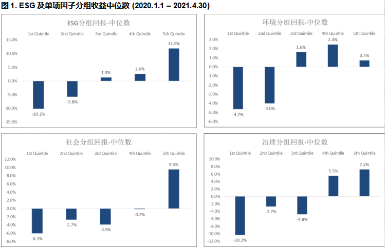 万得全A指数在2020年1月1日至2021年4月30日之间上涨了24.55%。同期我们看到,ESG评分与回报持续呈现较强的正相关关系,这也与我们之前的测试结果一致。其中ESG评分最高的第5组回报中位数高于分数最低的第1组22.1%,这证实了ESG领先者在短期市场低迷时期跑赢大市以及之后更强的股价回弹的能力。