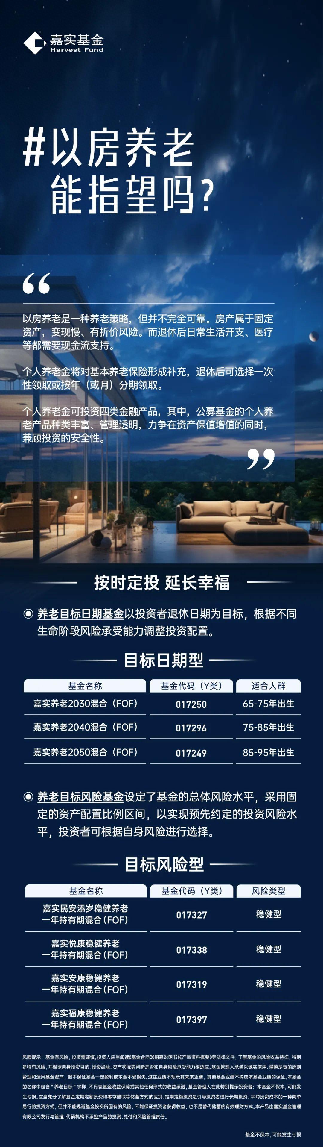 *风险提示:基金投资需谨慎,投资人应当阅读《基金合同》、《招募说明书》、《产品资料概要》等法律文件,了解基金的风险收益特征,特别是特有风险,并根据自身的投资目的、投资经验、资产状况等判断是否和自身风险承受能力相适应。基金管理人承诺以诚实信用、谨慎尽责的原则管理和运用基金资产,但不保证基金一定盈利或本金不受损失。过往业绩不预示其未来业绩,其他基金的业绩也不构成本基金业绩的保证。个人养老金可投公募基金范围具体以中国证监会确定的产品名录为准。“养老”字样不代表收益保障或任何形式的收益承诺,个人养老金基金不保本,可能发生亏损。不同产品的风险收益特征可能不同,投资人应根据自身年龄、退休日期、收入水平和风险偏好等选择合适的养老金基金。