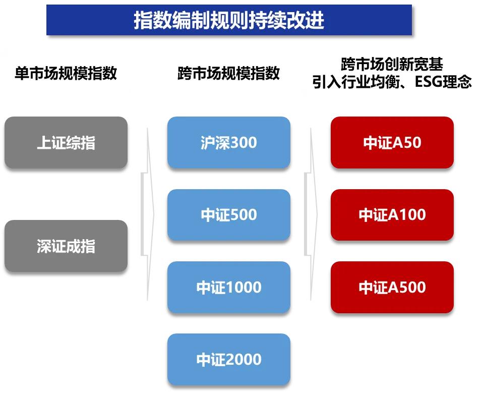 从最早的上证、深证单市场综合指数,到以沪深300、中证500为代表的规模宽基指数,实现了对A股资产市值结构的全面表征,再到中证A500为核心的A系列创新宽基指数,精选细分行业龙头、兼顾行业均衡,并且引入国际先进的ESG投资理念,指数的表征性和深度投资价值进一步提升。